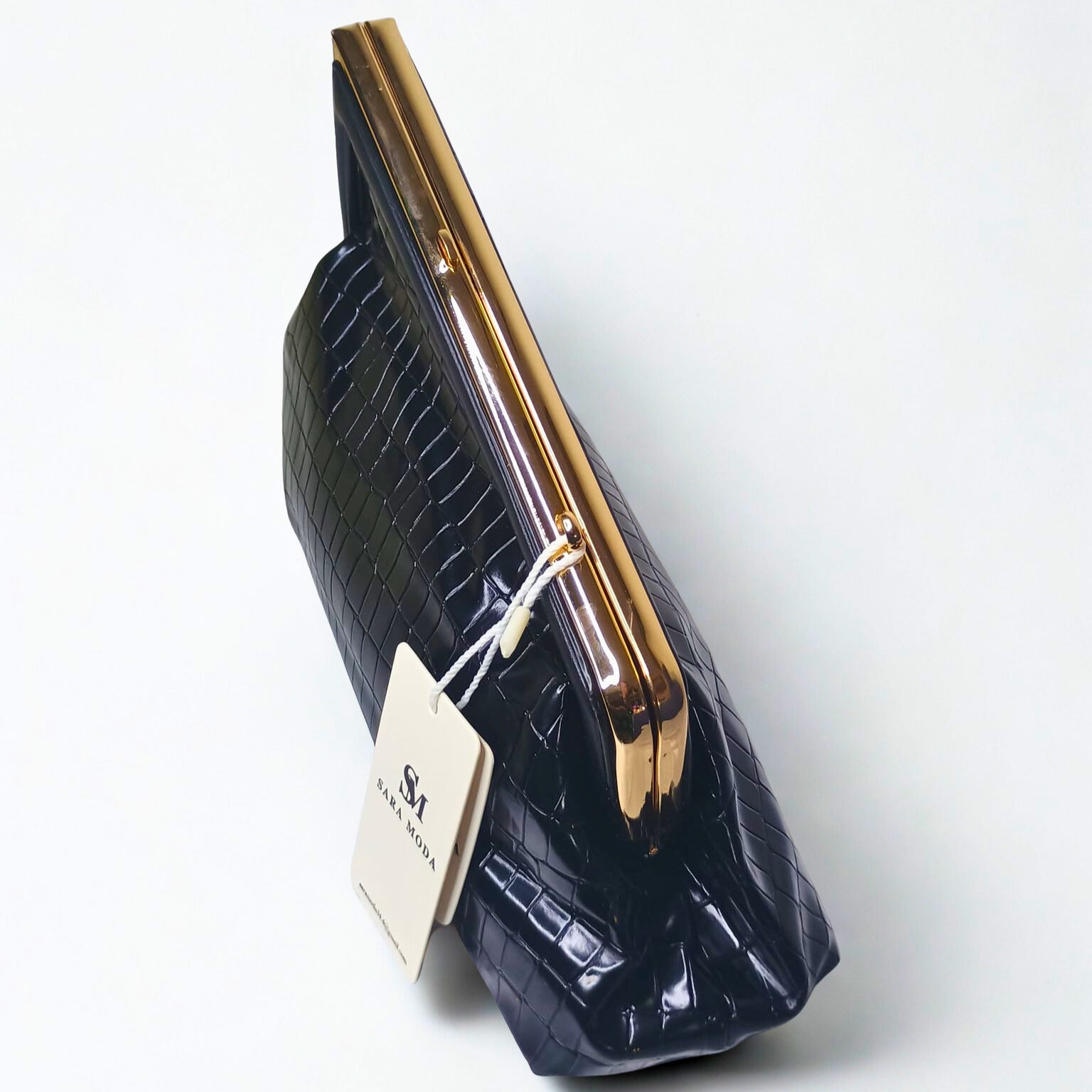Czarna kopertówka ze skóry krokodyla ze złotym łańcuszkiem i lamówką