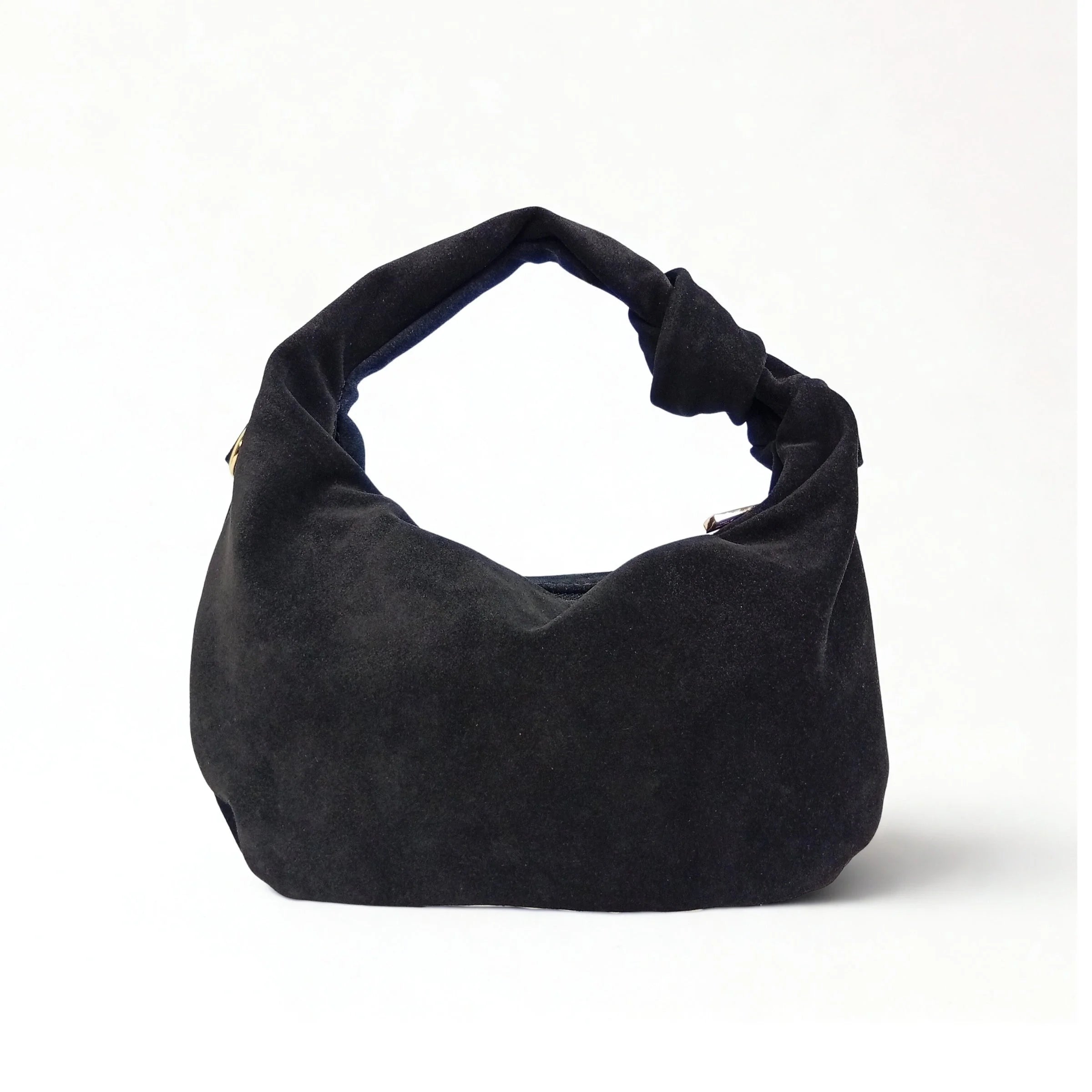 Hobo shoulder bag made from calf suede and produced in Italy. Features a soft exterior, a secure zip closure, and a relaxed silhouette suitable for everyday or occasion use.