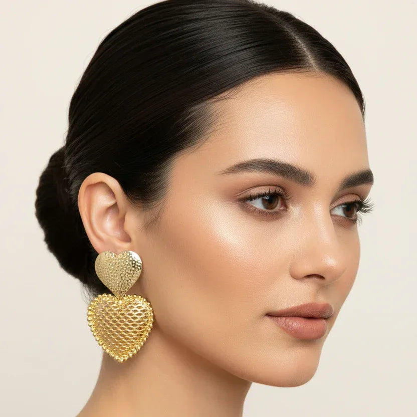 Żid togħma ta’ rumanzi mal-ħarsa tiegħek b’dawn il-żwiemel tal-qalb doppja f’ton tad-deheb. B’żewġ forom delikati tal-qalb imżejna b’ħardwer li jiddi f’ton tad-deheb, id-disinn eleganti tal-ħruġ joħloq moviment u dawl sabiħ. Perfetti kemm għall-użu ta’ kuljum kif ukoll għal okkażjonijiet speċjali, dawn iż-żwiemel iġibu ġmiel mingħajr sforz għal kwalunkwe libsa.