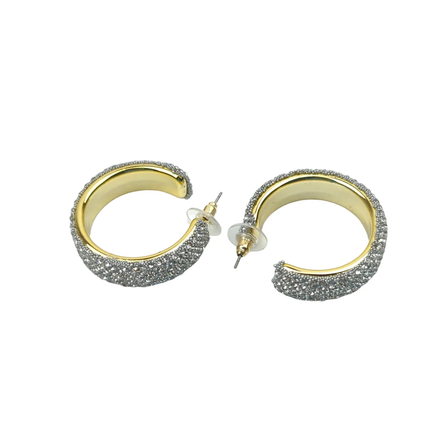 Lägg till en touch av glans till din vardagslook med dessa guldfärgade strasshoop-örhängen. Designade för att fånga ljuset från varje vinkel, är dessa klassiska hoops prydda med skimrande strass för en enkel glamorös finish. Den varma guldfärgade infattningen ger en tidlös känsla, vilket gör dem lätta att klä upp eller ner.